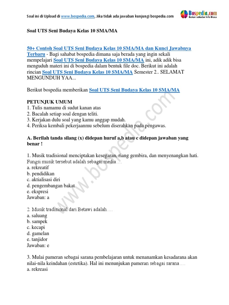 50 Contoh Soal Uts Seni Budaya Kelas 10 Sma Ma Dan Kunci Jawabnyad Docx