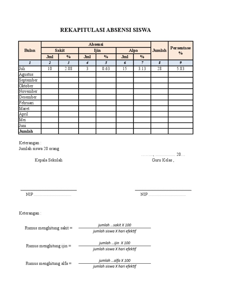 Dalam contoh ini hari efektifnya 15 hari. Terkadang ada guru atau pendidik yang menghitung persentase kehadiran untuk menentukan jenis ujian yang tepat untuk siswa-siswinya. 006 -laporan Bulan JULI 2015.
